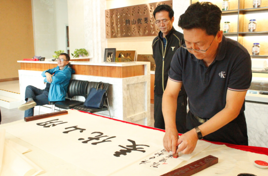 隨后,大家又來到燕麥博物館,感受燕麥文化、體驗燕麥產品的同時,并現場目睹書法名家張曉華老師的揮毫潑墨。孟才介紹,中國燕麥的市場份額在100億元以上,裸燕麥起源于中國,但是國內燕麥深加工所用的原糧90%是進口皮燕麥,只有10%是國產裸燕麥,主要原因是國產裸燕麥多采用傳統旱作耕作方式,人工除草,有機種植,不使用除草劑、農藥、化肥等,畝產較低。但是,也正因如此裸燕麥的口感更好、質量更佳且蛋白質、脂肪、β-葡聚糖等營養成分均高于皮燕麥。得天獨厚的資源優勢是陰山優麥建企立身的根基和市場競爭的底氣,產品全部采用優質的國產裸燕麥就是陰山優麥的核心競爭力!